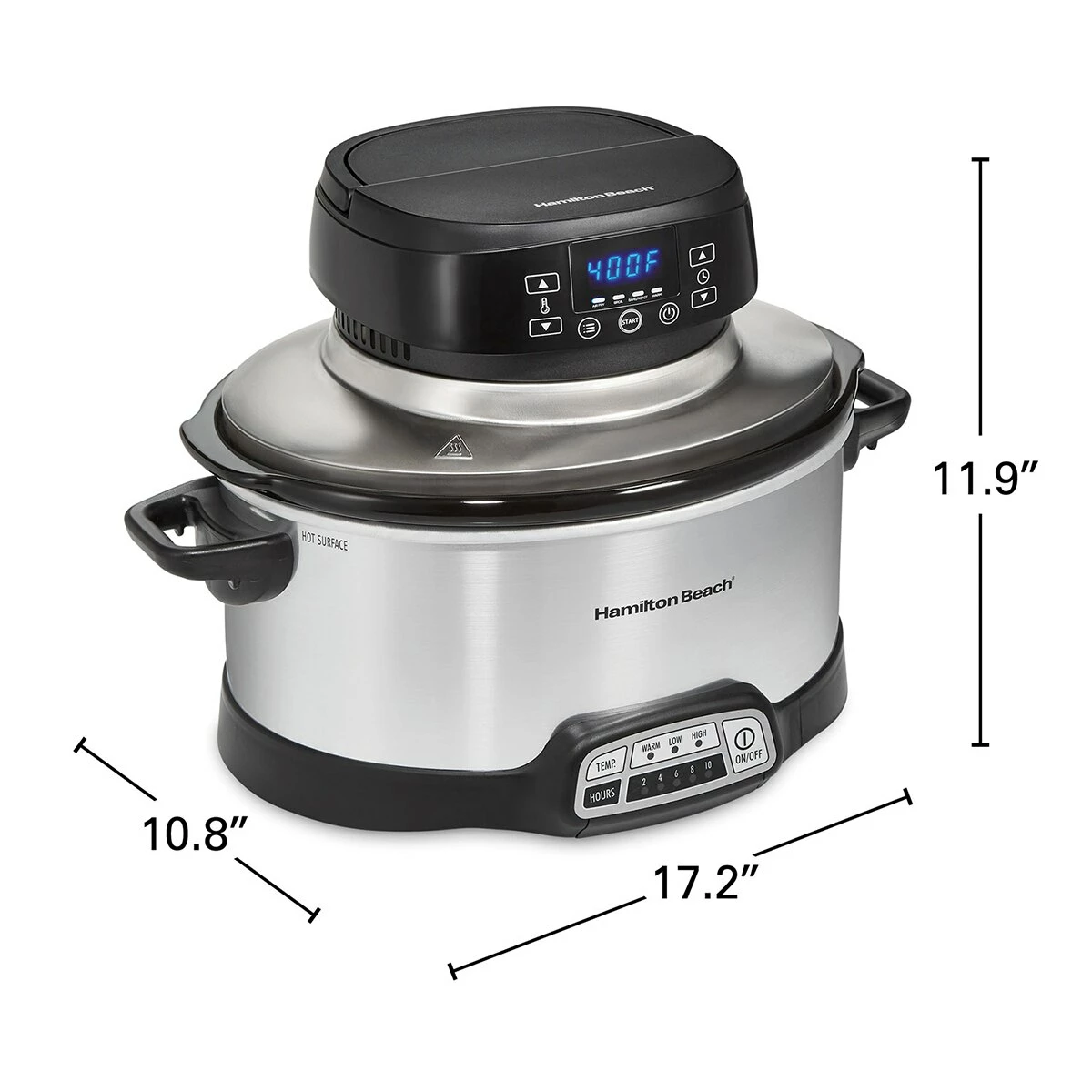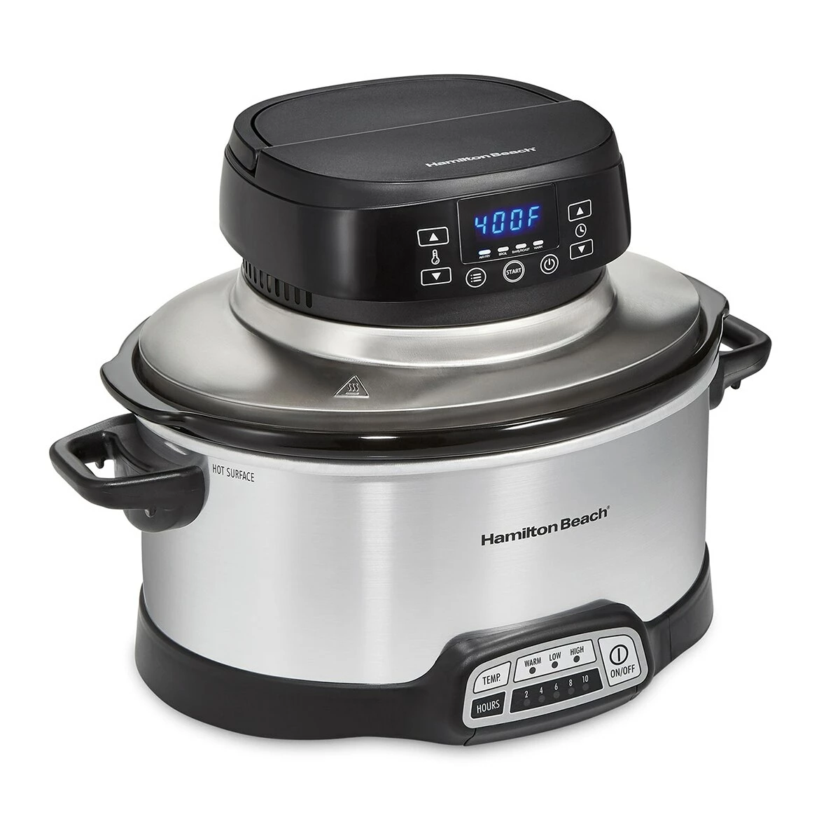 With the Hamilton Beach® 2-in1 Air Fry Slow Cooker, you’ll enjoy the versatility of 2 appliances in 1 because it’s an air fryer AND a slow cooker. This multifunctional 2-in-1 appliance lets you air fry food, brown and crisp food after slow cooking or slow cook with flexible programmability. Since the Hamilton Beach 2-in1 Air Fry Slow Cooker is easy to use, you can cook with confidence. To air-fry food or brown and crisp it after slow cooking, top the slow cooker with the air fry lid and use the control panel on the lid to select a pre-programmed cooking mode with a default cooking time and temperature. You can use the pre-programmed cooking modes to air fry, broil, bake, roast or warm and if needed, you can adjust each mode’s default cooking time and temperature with the arrow buttons. To slow cook, top the slow cooker with the glass lid and mix and match high, low, or warm heat settings with 2, 4, 6, 8, or 10 hours of cooking time.Includes air fry lid, folding stand for air fry lid, stainless steel air fry basket, 6 quart crock and glass lid.
