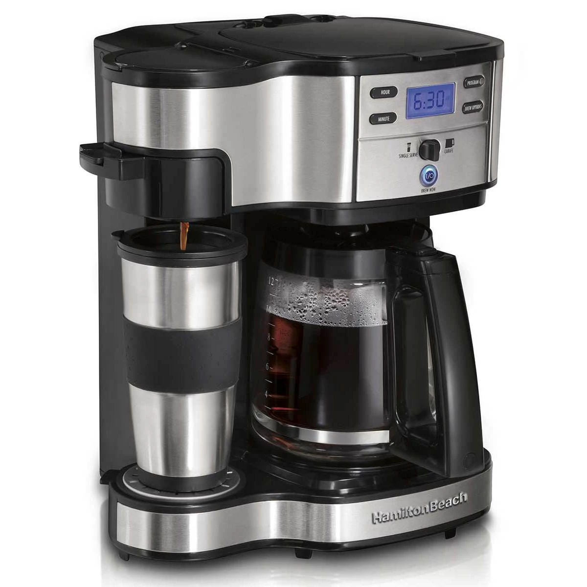 This Hamilton Beach 2-way programmable coffee maker is for all the coffee drinkers and aficionados who despise the long café lines, dread the overwhelming coffee options or need a fix for those early morning caffeine pains. There’s finally an affordable low-maintenance coffee maker that can brew basic or premium-roast coffee in a fraction of the time and cost of the coffeehouse. This versatile coffee maker lets you brew up to 14 ounces into a cup or travel mug with your favorite ground coffee. When you want a full pot, the carafe side brews up to 12 cups of ground coffee and gives you the option to program your coffee in advance for wake-up ready coffee. The coffee maker includes a 12-cup glass carafe and single-serve mesh scoop to easily measure and fill ground coffee.