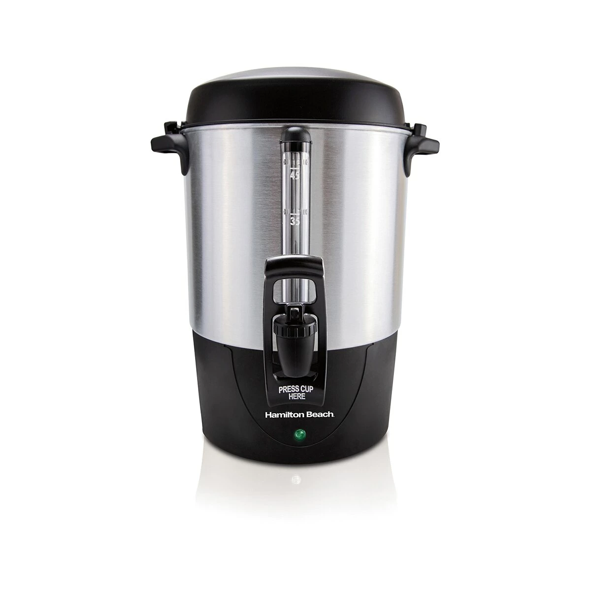The Hamilton Beach® 45 cup coffee urn rews coffee 30% faster*, reducing wait-time for your guests. The urn makes 15-45 cups of coffee, and brews 45 cups in just 28 minutes. The urn features dual heaters to keep coffee hot without overheating. The ready light illuminates to let you know when the coffee’s ready to serve. The urn is also great to use for hot tea and other drinks. Coffee is easy to pour from the urn using the easy-press lever, which is activated at the push of a cup making it easy to pour coffee using just one hand. The urn easily dispenses coffee into any kind of cup, even disposable cups. Clear water level markings in the urn’s water/coffee level window make it easy to see how much water you’re adding or how much coffee is left in the urn. The removable coffee filter basket lifts from the urn and is easy to clean in the dishwasher. No paper filters are needed. The brushed finish looks great with every decor and resists fingerprints.