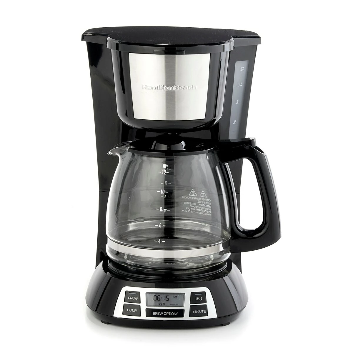 Easily brew your daily coffee with this sleek Hamilton Beach® 12 cup programmable drip coffee maker with stainless steel accents that will look great in your kitchen. It has Easy-Touch programming so you can program it the night before and wake up to piping hot coffee every morning. After brewing, coffee stays warm in the carafe for 2 hours, then the power automatically shuts off for your peace of mind. The Auto Pause & Pour feature briefly delays the flow of coffee so you can sneak a cup before brewing ends without making a mess. Each brew is flavorful with 3 Select-a-Brew options: regular, bold, and 1-4 cups for brewing smaller servings. The coffee maker is easy to fill and features a large water window that makes it easy to view the precise water level from the front of the machine. For easy cleanup after brewing, the 12 cup glass carafe and removable brew basket are dishwasher safe.