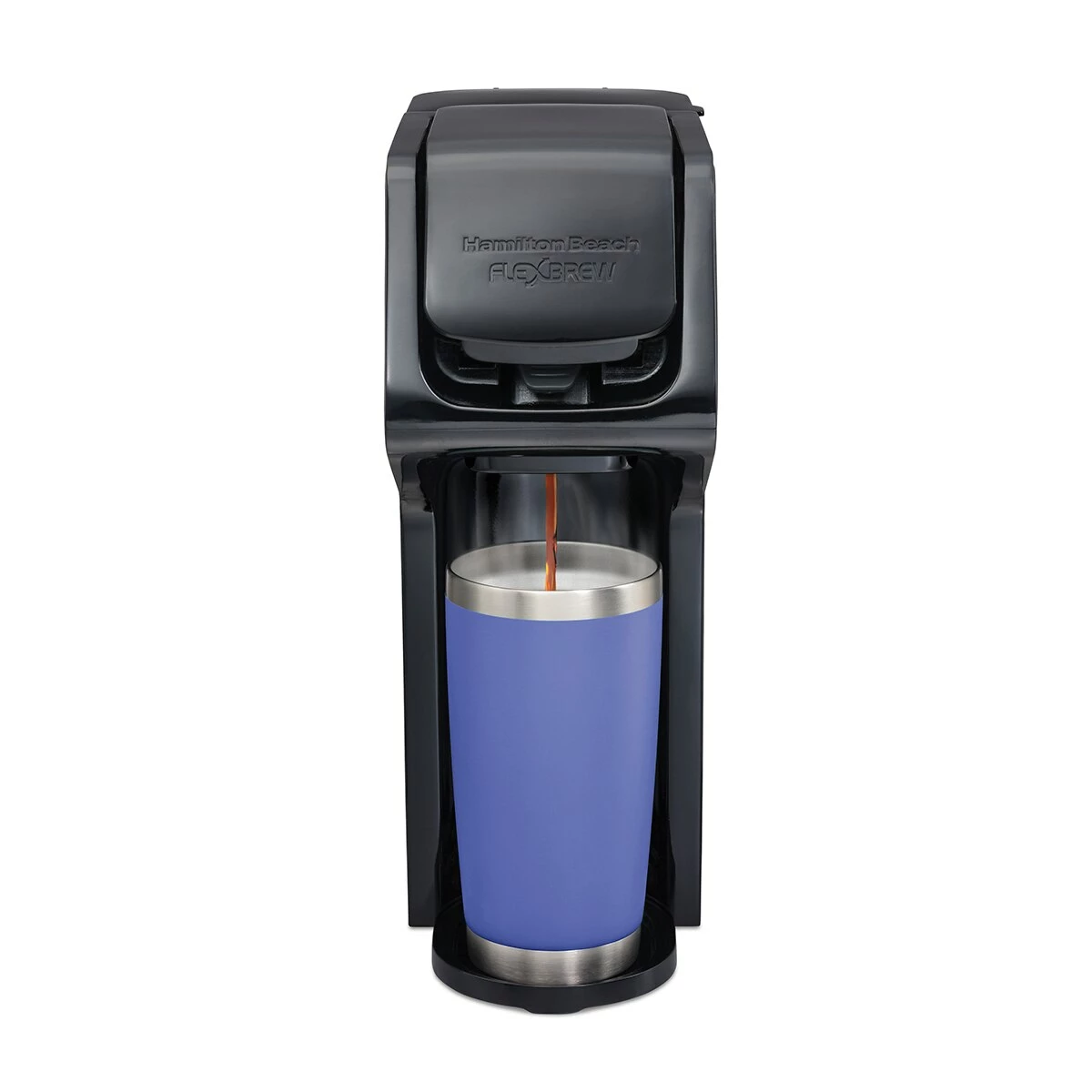 Brew a cup of hot delicious coffee with the Hamilton Beach FlexBrew® single-serve coffee maker and enjoy the flexibility of brewing two ways. Simply add a K-Cup®*pod or your favorite coffee grounds, add water, lower the lid and press a button and your coffee will be ready in about two minutes. In addition to fast brewing, this coffee maker lets you brew into a cup or travel mug, and you can make up to a 10-ounce serving with a pod or up to 14-ounce with coffee grounds. The slim design of the FlexBrew single-serve coffee maker is not only attractive, but it also saves counter space and fits practically anywhere since it measures less than 5 inches wide. Capacitive-touch controls provide easy touch-sensitive operation and the 14-ounce water reservoir is easy to fill. The cup rest holds a standard-size cup and it removes to let you brew into a 7-inch tall travel mug, and it has a storage area for the included single-serve brew basket or pod holder.