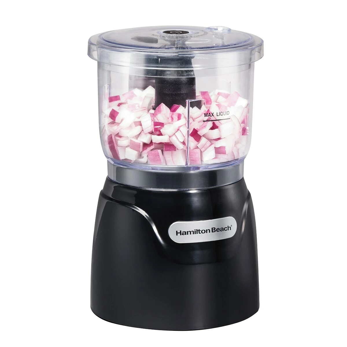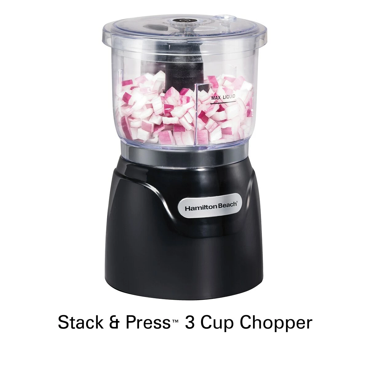 The Hamilton Beach® stack & press 3 cup chopper makes your prep time disappear! Just press the top for quick control and makes chopping any food go quickly! Plastic. Stainless steel. Dishwasher safe parts. Dimensions: 5.51″ x 5.51″ x 6.3″.