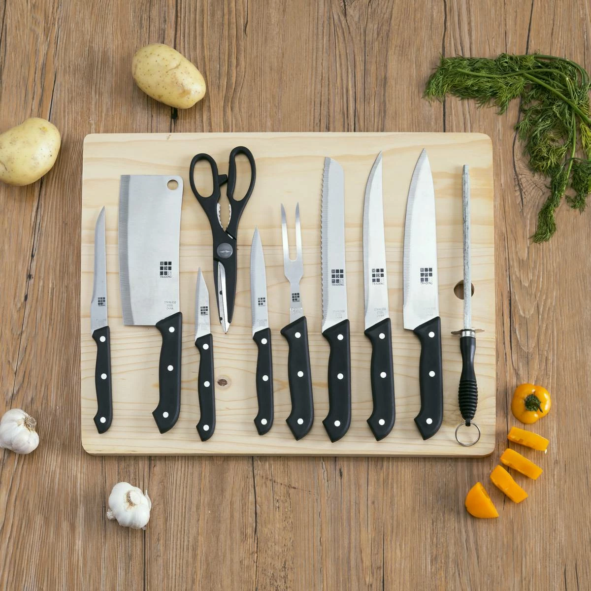 Cut and prepare food like a pro with this Home Basics 10 piece knife set. Made from high carbon stainless steel blade. Non-slip, soft grip TRP handle. Forged extra wide handle for stability and control. Includes a wood cutting board.