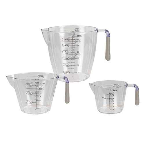 The Home Basics 3 piece measuring cup set and rubber grip lets you measure your ingredients precisely! It comes complete with a rubber grip that ensures control in your food preparation. Hand wash. Plastic. Rubber. Dimensions: 5.87”H x 4”W x 7”D.