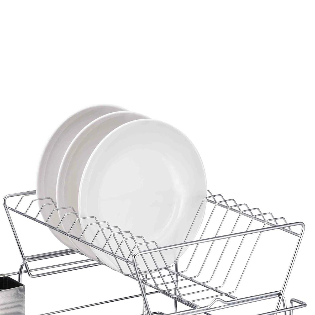 Dry and organize your dishes in this Home Basics chrome dish rack. Made from high-quality chrome steel and holds a lot of dishes to air dry with a removable cutlery holder. Fits neatly on countertops and cabinets.