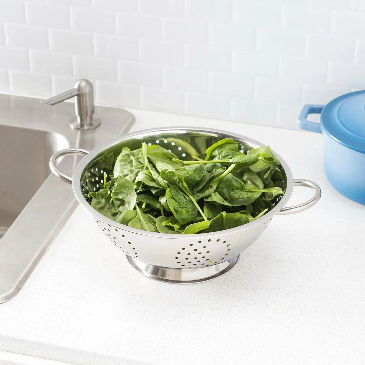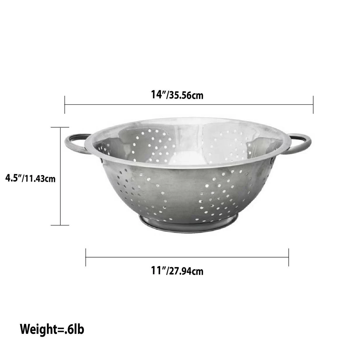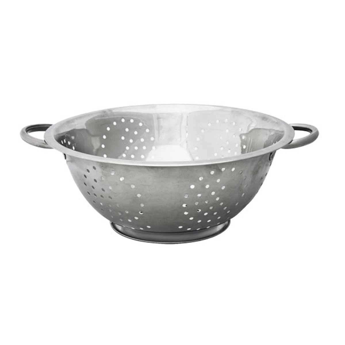 Strain pasta or wash fruit and vegetables with ease using this Home Basics deep colander. This colander provides enough room to place and prepares ingredients, while the classic stainless steel finish and rounded design make it a perfect addition to any kitchen. Evenly distributed perforations around the colander and open metal handles make it quick and easy to drain cooking liquids and more.