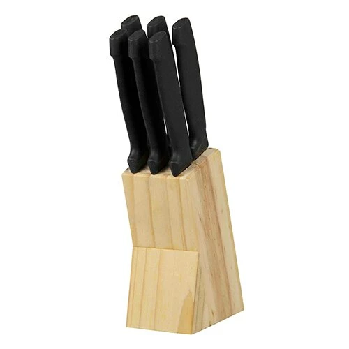 The Home Basics 6 piece stainless steel knife lets you cut and prepare food like a pro! Made with stainless steel blades and serrated edges this set includes a sleek display block. The hygienic polypropylene handles are great for control and they are top-rack dishwasher safe. Hand wash.