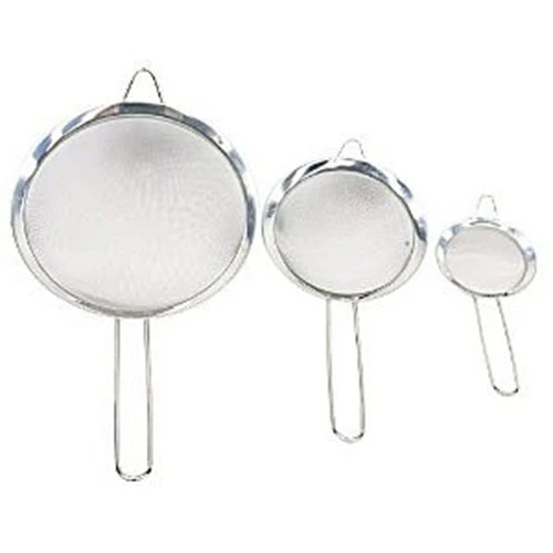 Home Basics Mesh Strainer Set. This durable stainless steel mesh construction 3-piece mesh strainer set is useful for straining pasta or washing fruits and vegetables.The set includes small 3.5-Inch diameter colander, medium 5.5-Inch diameter colander, and large 8-Inch diameter colander.