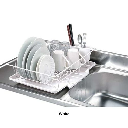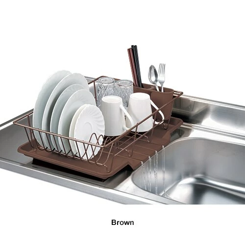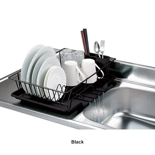 The Home Basics 3 piece steel dish drainer helps you dry and organize your dishes in fast and simple way. It fits neatly on countertops and cabinets and holds a fair amount of dishes with a removable cutlery holder and a heavy duty plastic tray. Made from high quality chrome Steel. Hand wash. Dimensions: 5”H x 12”W x 19”D.