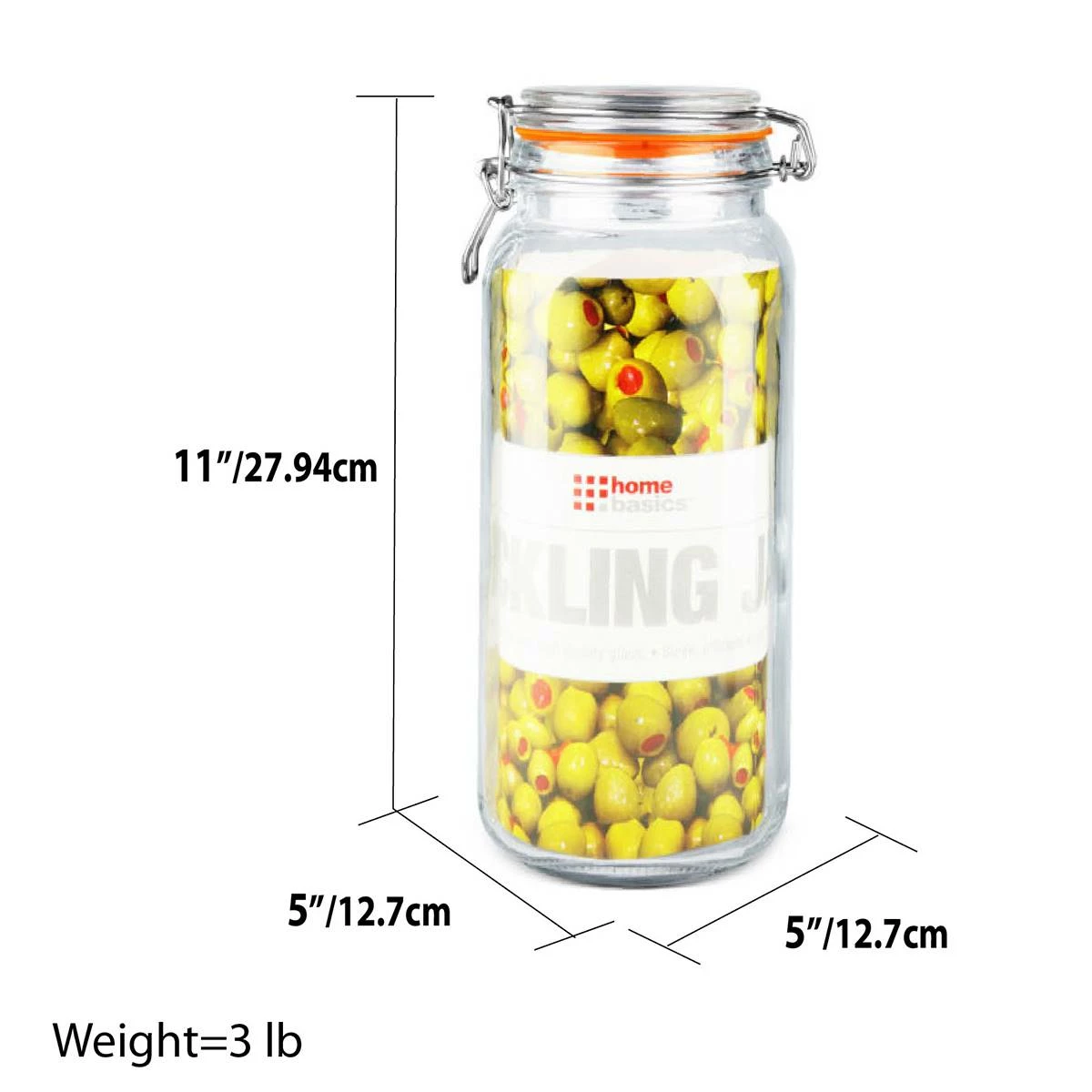 The Home Basics glass jar is solidly constructed of thick glass and features a wide mouth to make filling and preserving food simple and easy. The transparent finish beautifully showcases the contents inside, while also making it easy to know when itβs time to stock up. The metal bail lid and vibrant orange rubber ring, provide an air-tight seal, resulting in longer shelf life.