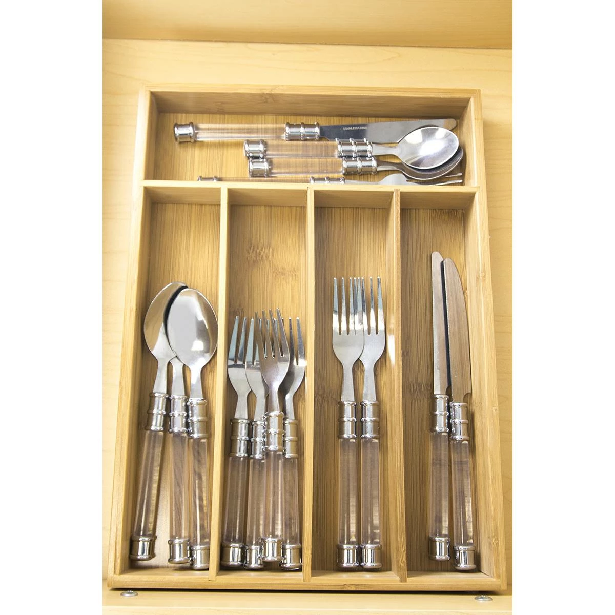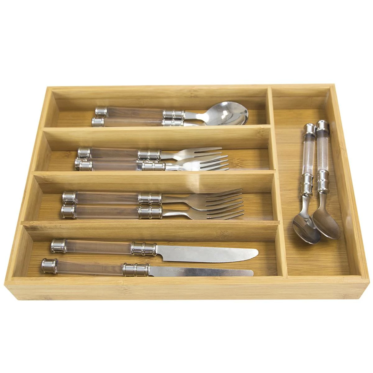 Brighten up your kitchen drawers with this Home Basics bamboo cutlery organizer. Made from all-natural bamboo with a natural finish. It features 5 spacious compartments to neatly organize everything from cooking utensils, silverware, and jewelry. Lightweight yet very sturdy, it fits great in most cabinets and drawers.