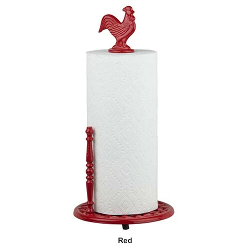 The Home Basics rooster paper towel holder keeps your paper towels close at hand. It is made with heavy weight cast iron steel that is rust resistant. Its simple rooster design is perfect for any kitchen.