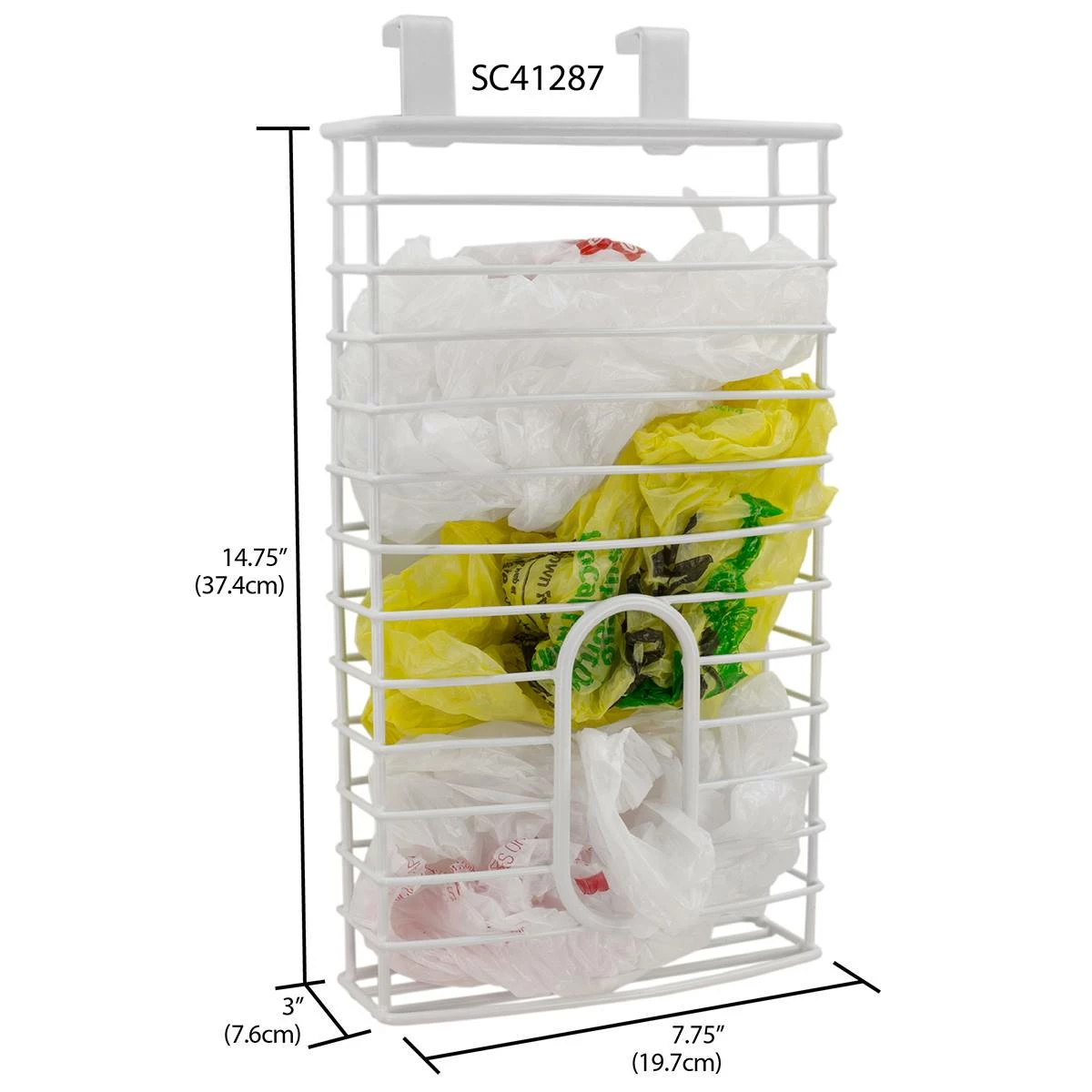 Say goodbye to the mangled mess of grocery and shopping bags that clutter up the inside of your cabinet, and invest in this Home Basics over the cabinet organizer. This large capacity plastic holder easily accommodates up to 50 plastic bags in one easy to spot location. The organizer easily attaches to an interior cabinet door for discreet storage or on the outside to keep it out and open when you need it. The back hooks provide a snug fit, while the soft, foam backing protects the door surface.