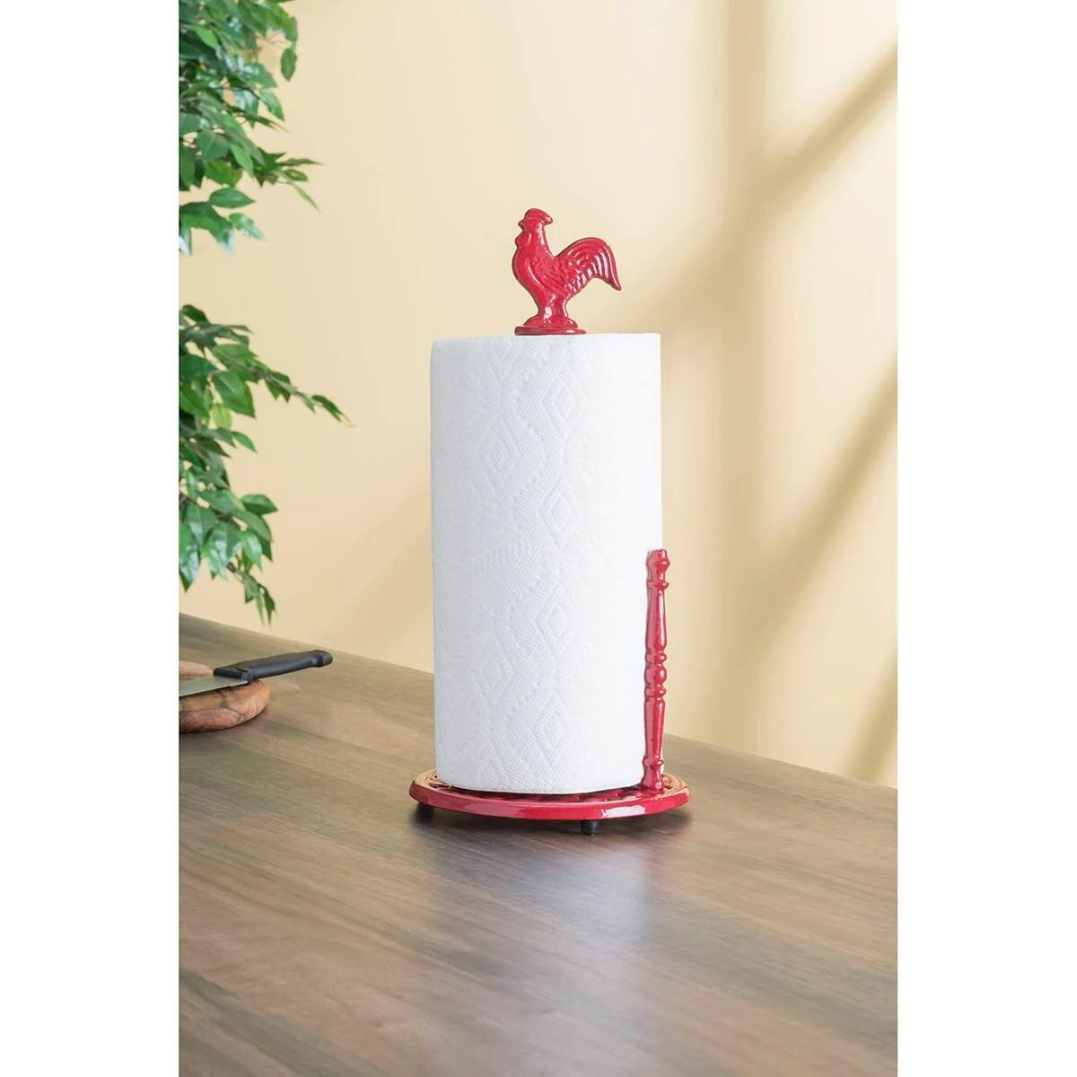 Enhance your country chic kitchen with this Home Basics paper towel holder. The twist-open top is stylized in the form of an adorable rooster, gracefully perched on a pedestal for all to cock-a-doodle-do in amazement. Finished in a rich ruby hue, the holder also features a scrolled metal stopper and a weighted cross-hatched base to make it easy to tear a single paper towel sheet.