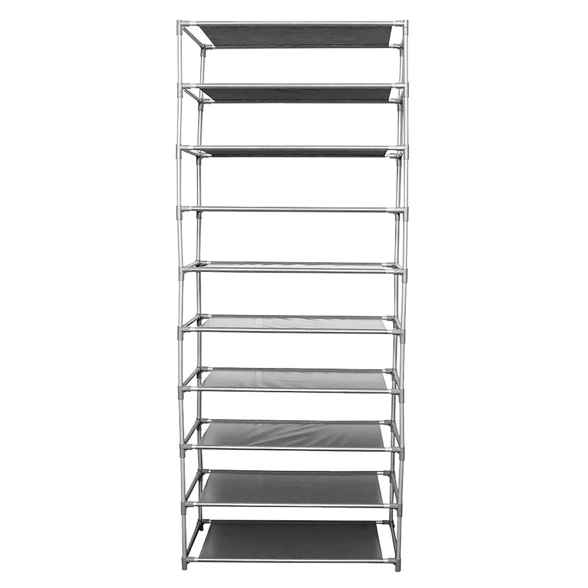 Free up your floor space with this Home Basics 10 shelf shoe rack. This multi-level shoe organizer features a metal frame with a neutral matte grey finish to coordinate with a variety of spaces. Open non-woven shelves make it easy to find the pair of shoes you need, while also promoting airflow to limit the number of unpleasant odors that can emit from used shoes. Each non-woven shelf is slip-resistant to ensure your footwear collection remains neatly in place for all to admire.