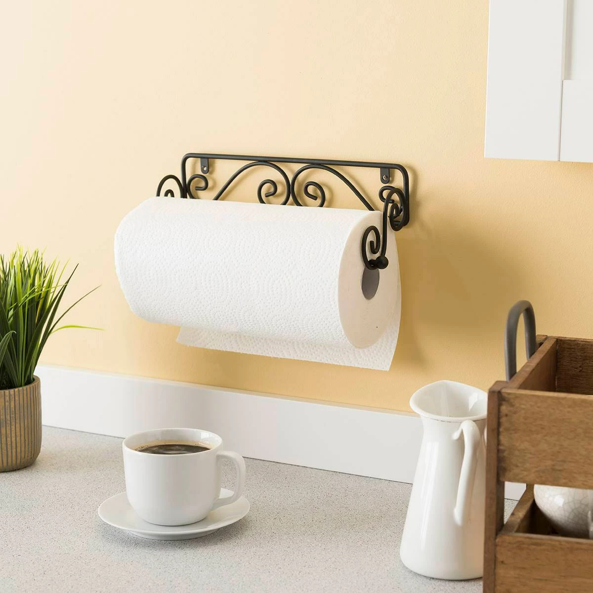 Keep clutter off the counter and paper towels close at hand with this Home Basics wall mounted paper towel holder. The holder is constructed out of steel for strength with an intricate scroll that adds a traditional touch.