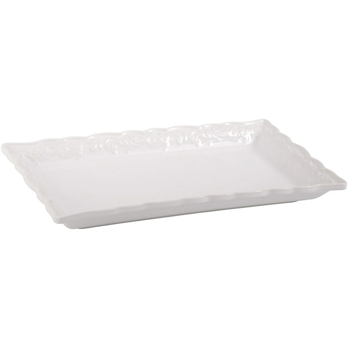 The charming Home Essentials 13-inch white rectangle ruffle edge tray offers modern style to your formal or casual dining table. Elevates your table with a simple charm.