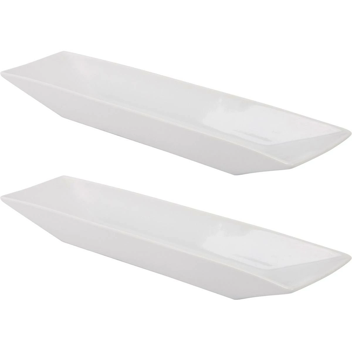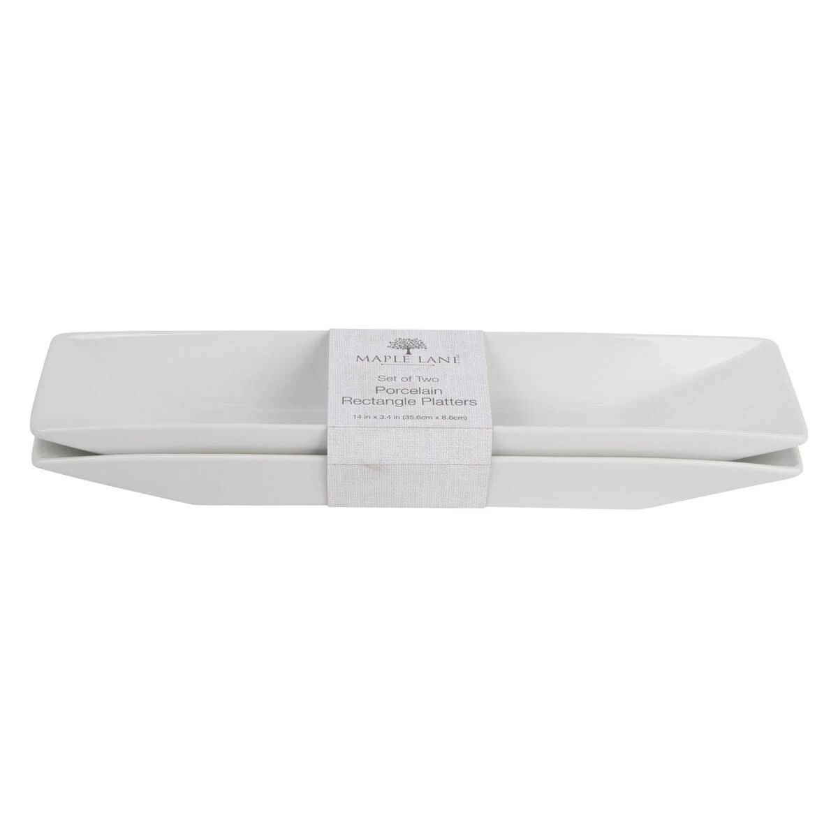 The Home Essentials 14-inch set of 2 white porcelain rectangle bowls bring contemporary style to your table. They are perfect for formal dinners or casual meals.