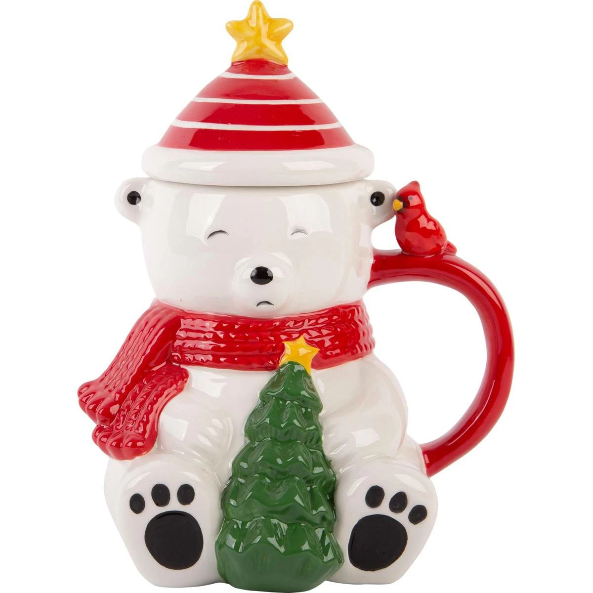 Enjoy your favorite hot drinks in this adorable Home Essentials 16-ounce polar bear-covered mug with a hat. The shiny ceramic polar bear mug is detailed all around, with gold stars on the hat and tree, a red scarf, and cardinal, hat, and handle. Fun for kids or adults, the cute Christmas mug with a lid makes a thoughtful holiday gift for anyone on your list.