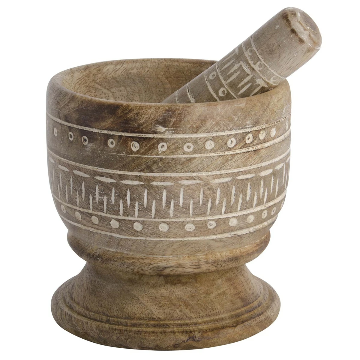Distinctive accents adorn this Home Essentials 5-inch etched wood mortar and pestle. Ideal for crushing fresh herbs and spices, garlic, peppercorns, seeds, and more.