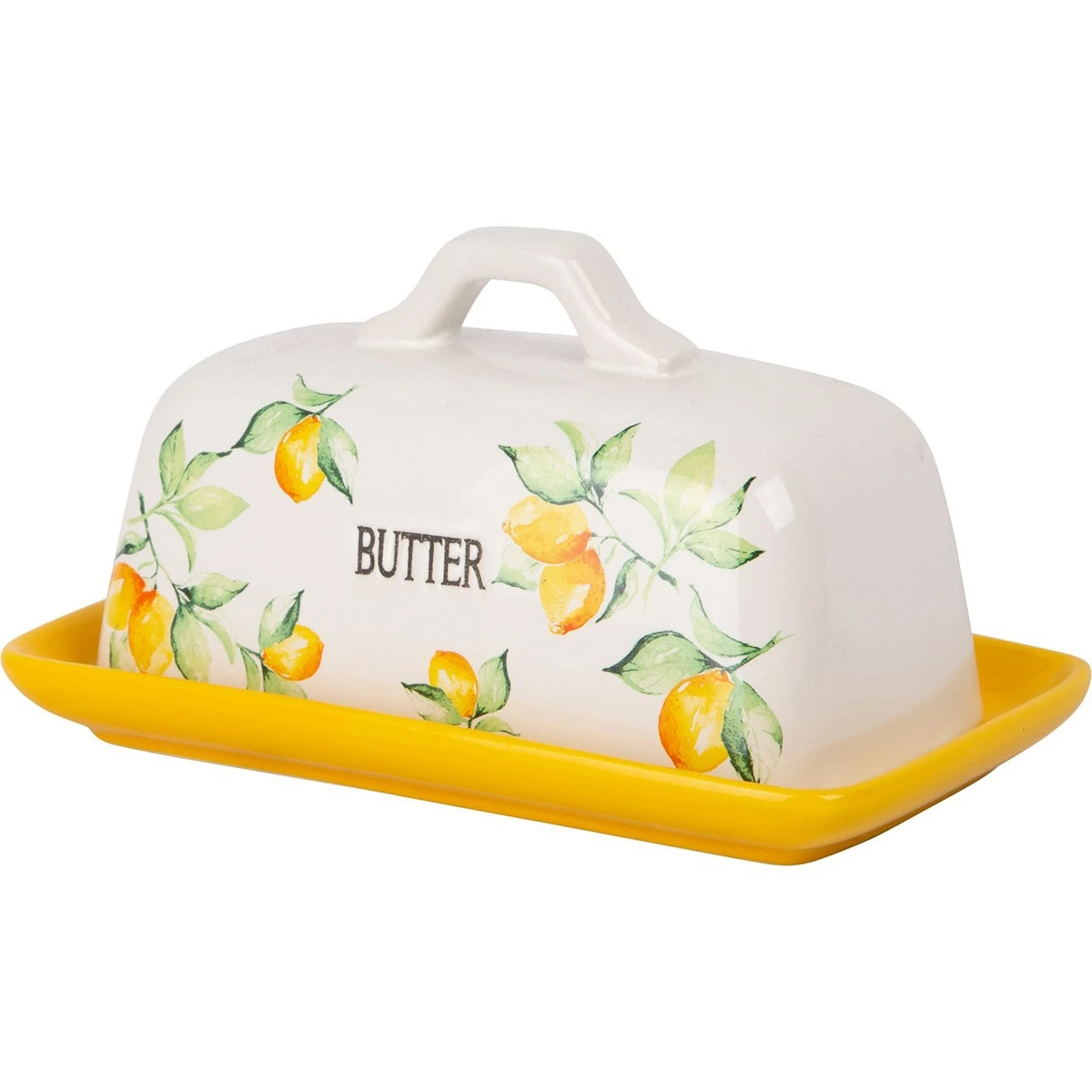 The Home Essentials 6.7 inch lemon garden covered butter dish has a bold design that elevates your kitchen decor while storing your butter safely away!