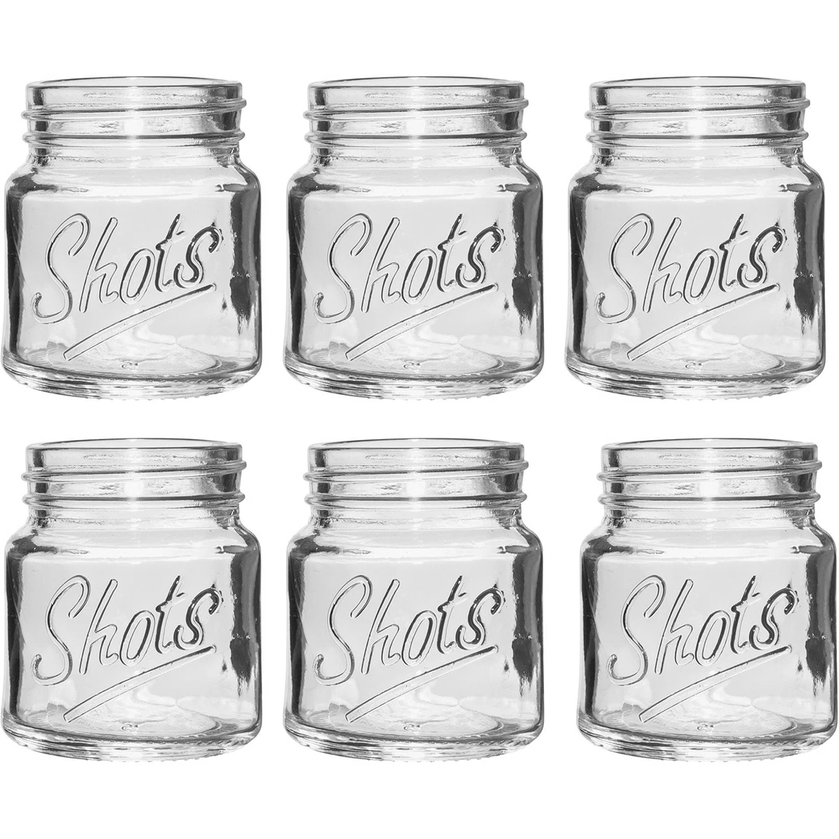 Toast in classic fashion with this set of six mason jar-inspired Home Essentials basic 2.5-ounce shot glasses. They each feature a traditional design on a smaller scale with an embossed “Shots” script. A wonderful addition to your barware collection that you can use when guests are over.