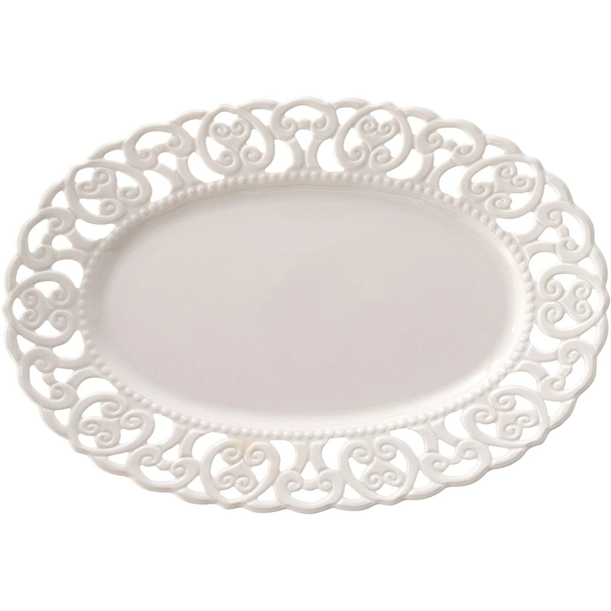 The Home Essentials pierced scroll oval platter is embossed and has antique detailing for a dynamic look. Decorate your dining room scene with this one-of-a-kind piece that exudes poise and appeal.