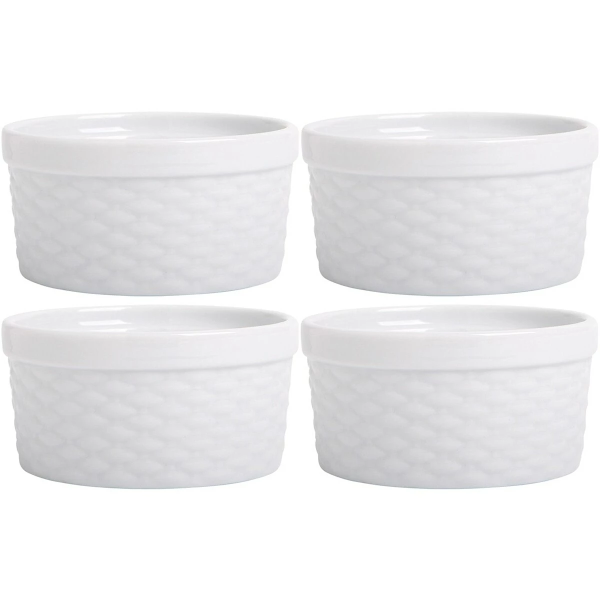 Pies, pudding, and beyond! This set of four Home Essentials white 8-ounce basket weave ramekins is perfect for making individual servings of crème brulee, french onion soup, soufflés, casseroles, and more. These porcelain ramekins can also be used to serve nuts, pretzels, and other party snacks.