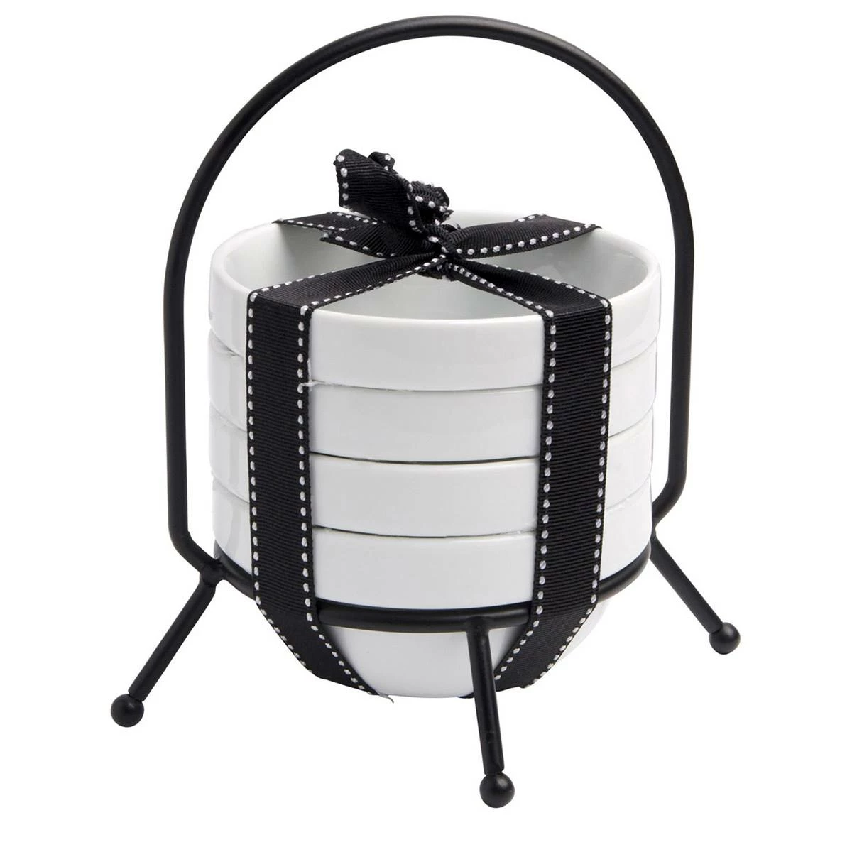 Whether for entertaining or everyday use the Home Essentials White set of 4 snack bowls with rack are a sophisticated choice for dining. Each set of 4 bowls comes with a space-saving metal rack for easy storage and even easier cleanup.